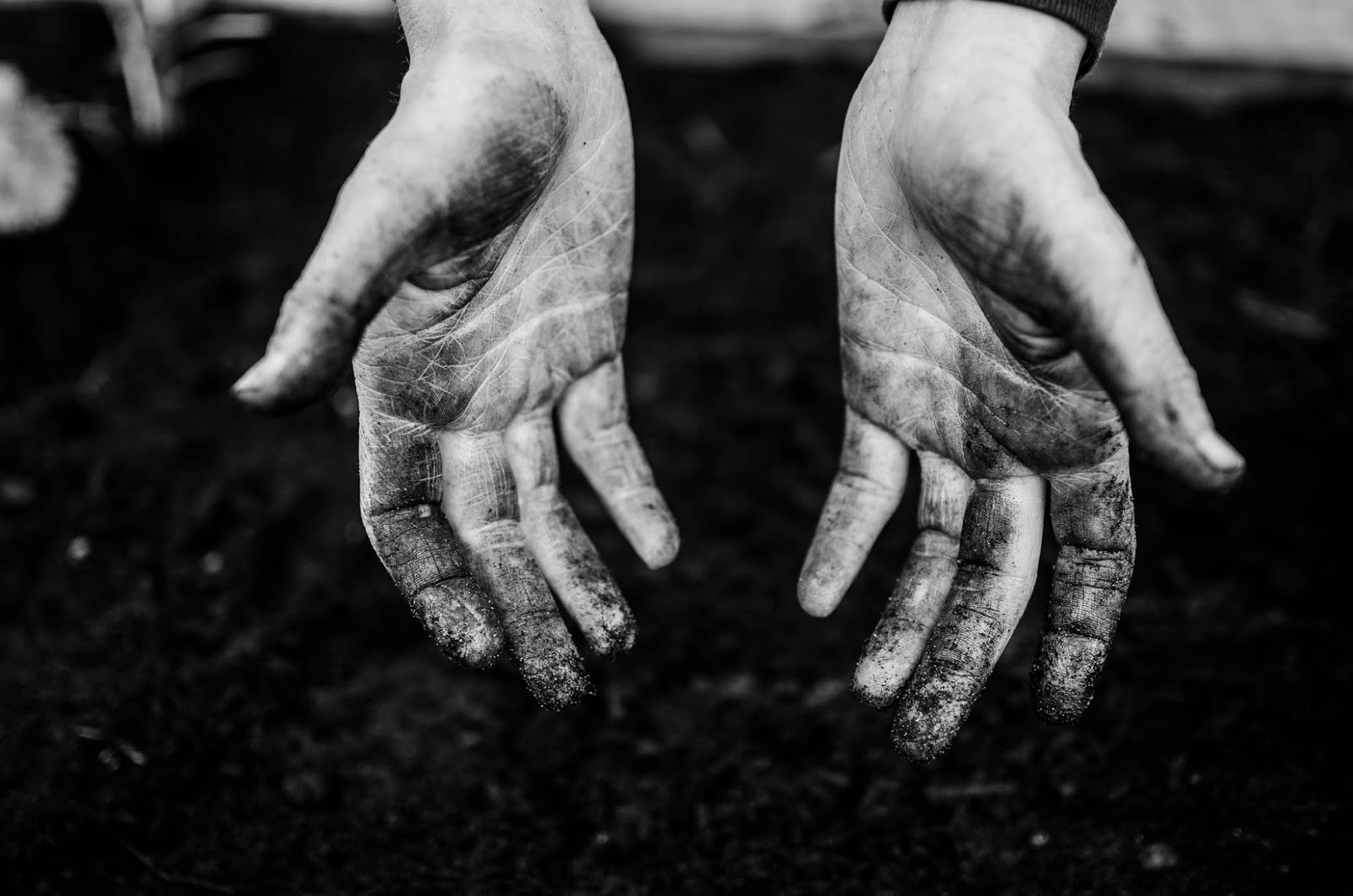 Garden hands. Black and white image of a gardener's hands covered in soil.